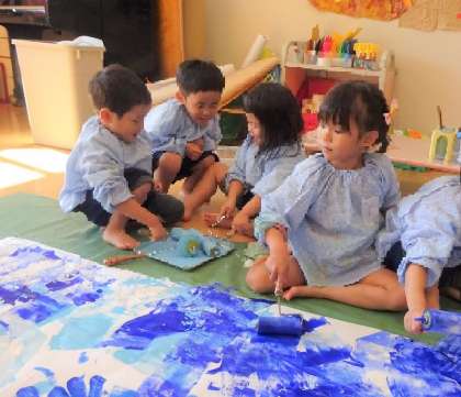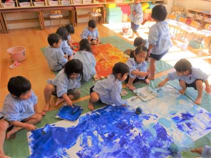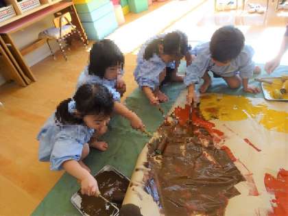 ローラー遊び(3歳児) 公開日 2023/11/22 更新日 2023/11/22 お知らせ 先日「三びきのやぎのがらがらどん」のヤギを紙製作でしたので、今日はローラーでトロルと川をつくりました。 ローラーは以前にもしたことがあったのですが、ダイナミックに伸び伸びとできるのが楽しいようで、とっても喜んでいました。 手や足が汚れるのもだんだんと気にならなくなり、後で洗ったり拭いたらとれる、ということも分かってきています。その分、思いきり楽しめるようになりました。 いいね(0)