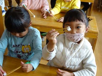最後に2本の箸で、豆腐に見立てたスポンジをつかんで遊びました。