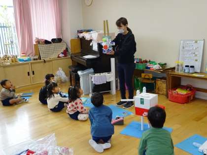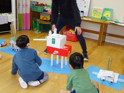 お家の方が持ってきてくださっている、箱や様々な素材を使って、それぞれに作って遊んでいます。