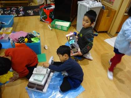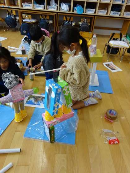 作品作り(5歳児) 公開日 2023/11/27 更新日 2023/11/27 お知らせ 5歳児も、大きな箱を使って、想像したものを形にしていきます。 「こう作らないといけない」という答えがない自由性は、時には難しいものです。 模倣なら考えなくてもできますが、自分で初めから作ることは、想像力、考える力、集中力が必要です。 子どもたちは頭の中で想像したものを形に作ることを楽しんでいます。 幼児期にしか表現できない自由な作品作りは、とても貴重な経験です。 いいね(0)