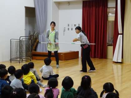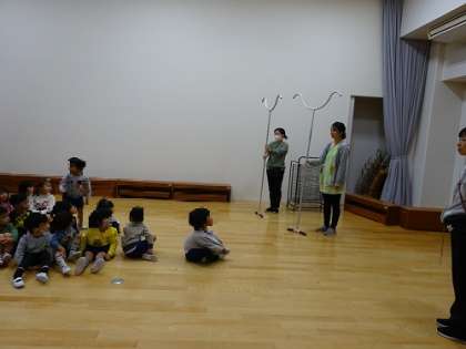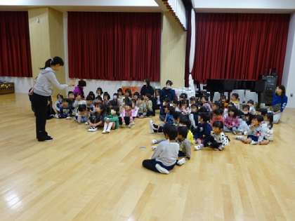 写真は避難訓練が終了し、遊戯室で話をしているところです。