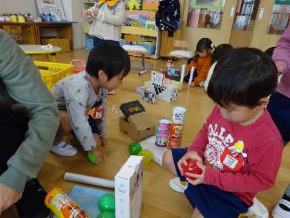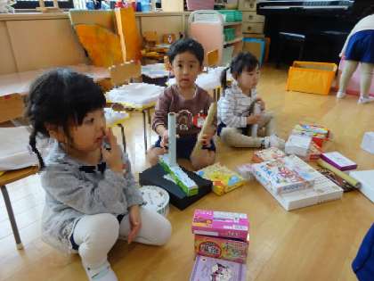 並べてみたり、積み重ねてみたりして、できた形から「お家になった」「ウサギに変身したよ」と見立てたり、「ロボットつくる」とつくりたいものをイメージして並べたりしている子もいました。