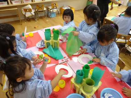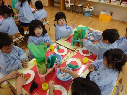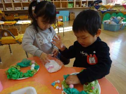 リースづくり(3歳児) 公開日 2023/12/04 更新日 2023/12/04 お知らせ 先週の金曜日にみんなでリースづくりをしました。 紙皿にお花紙を丸めてつけていくのですが、小さく丸める子や、ダイナミックに丸める子、それぞれ丸め方にも個性が出ていました。 今日はリースの飾り付けをしました。 素材を自分で選んでつけることを楽しんでいます。 金曜日からつけるのを楽しみにしていた子もたくさんいました。 また、水曜日に一緒につけましょうね!楽しみにしていてくださいね。 いいね(0)