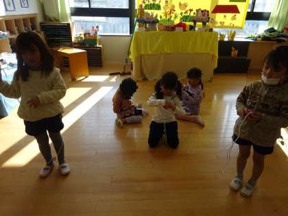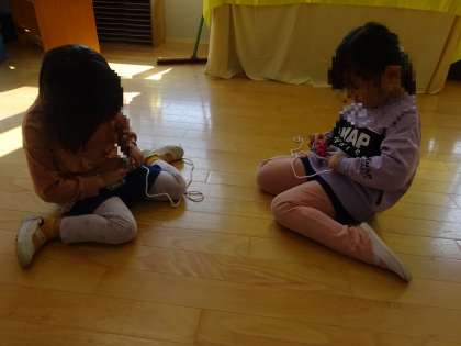 ひもを巻くのに苦戦している子もいれば、「回せた!」と喜ぶ子もいました。