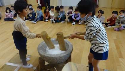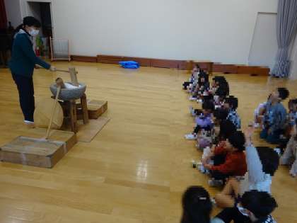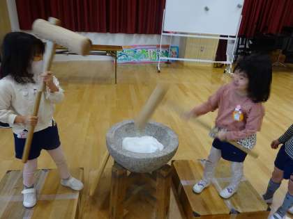 もちつき遊び(5歳児) 公開日 2023/12/14 更新日 2023/12/14 お知らせ もちつき遊びをしました。 もちつきで使ういろいろな道具を知り、明日のもちつきを楽しみにしていました。 「ぺったんこ それ ぺったんこ」と歌いながら、明日に期待を膨らませていました! いいね(0)