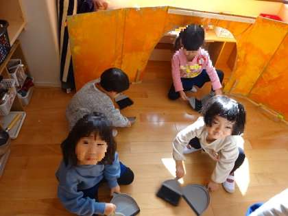 こうして、使った後は自分たちで掃除をする習慣は、3歳児クラスでも大切にしています。