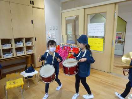 また、普段遊んでいる楽器を劇遊びに取り入れたり、どんな道具がいるかのアイデアを出し合ったりしています。