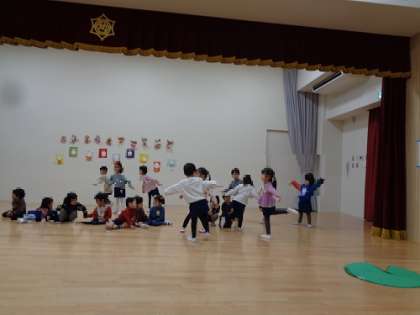 4歳児(ほし組) 公開日 2024/01/18 更新日 2024/01/18 お知らせ トンボのなって遊んでいました。 ピアノの合わせて動いたり、止まったり…。 また、友達と一緒に歌を歌ったりもします。 絵本を基に表現しますが、脚本は子どもたちと作っていきます。 先生と子どもたちの表現の世界をお楽しみに! いいね(0)