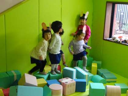 劇遊びでしている登場人物になりきって、耳やしっぽをつけて友達と一緒に遊んでいました。