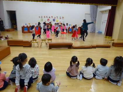 他のクラスの様子を見ると、それが刺激になり、また自分たちの表現につながったり、発表会が初めてのいちご組にとっては、「こんなふうにするんだな」と前に立ってすることを自然と感じたりすることができ、とてもいい経験になりました。