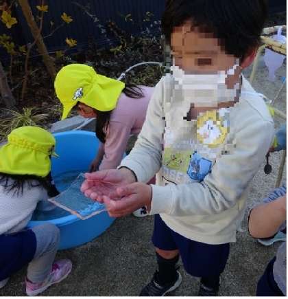 先週、とても寒い日がありました。遊ぼうと子ども達が園庭に出たら、「先生、氷ができてる〜」と嬉しいそうにびっくりした賑やかな声が聞こえてきました。