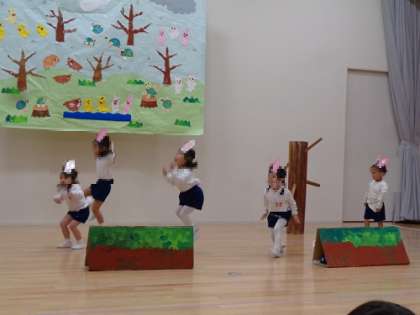 それを3歳児は、友達から離れ、前になって言葉を話していました。もちろん恥ずかしくて前を見れない子どもたちもいますが、3歳児でこれだけのお客様の前で立っているだけで、大変な成長です。