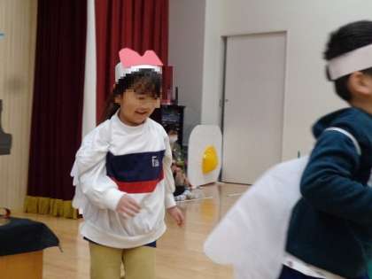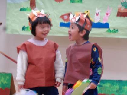 5歳児のはにかみながらも、劇を楽しんでいる表情…。緊張もするし恥ずかしいものですが、言葉は自信をもって話しますが、ふとダンスや追いかけっこになったときに、恥ずかしさが出てしまう何とも言えない表情です。とってもかわいいですね。まだまだ5歳児、でも頼もしい5歳児…。明日はどのような表情を見せてくれるのか楽しみです!