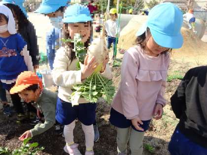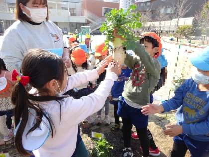 大根と人参の収穫(5歳児) 公開日 2024/02/14 更新日 2024/02/14 お知らせ 畑の大根と人参を収穫しました。 友達と一緒に「よいしょ!」とぬいて、「うわあ」「大きい!」「見て。面白い形!」などと、思ったことを声にしながら楽しんでいました。 お店ではなかなか人参の葉っぱを見ることができません。 初めて葉っぱ付きの人参を見たこどもも多かったです。 栽培や収穫を通して、季節に応じてできる食べ物に関心がもてるようにしていきたいと考えています。 いいね(0)