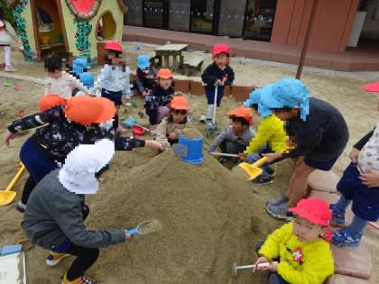 いろいろな学年が関わりながら、砂場で楽しそうにつくっていました。
