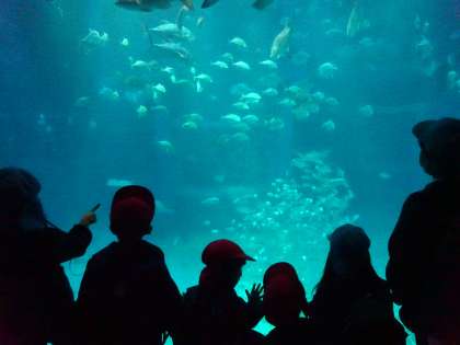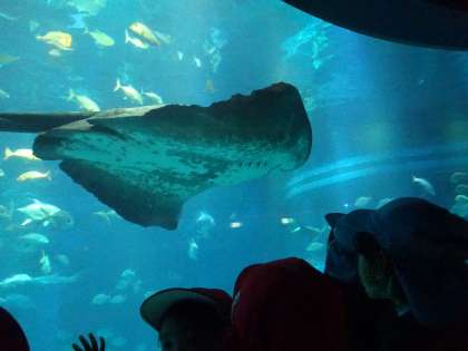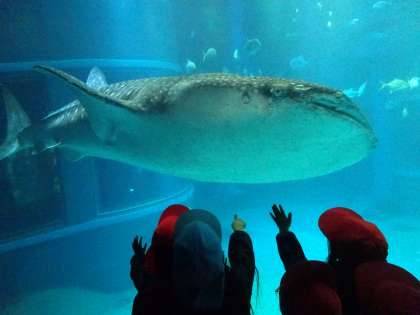 ジンベイザメやエイは大きく迫力があり「めっちゃ大きい!」「こっちくるよ!」「すごいなぁ!」と大喜びでした。