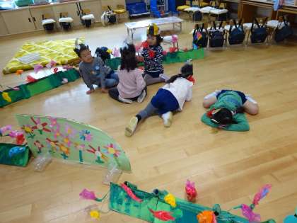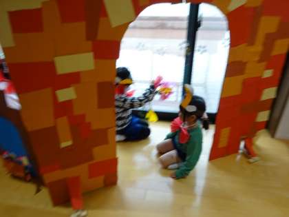 生活発表会は終わりましたが、引き続き、劇遊びの大道具や衣装を使ってごっこ遊びを楽しんでいます。劇遊びを経験し、クラスの友達と一体感を感じたことにより、友達同士の関わりがより深まってきています。