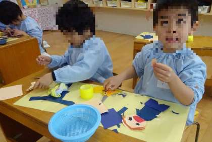 「サッカーしてるところにしようかな」と足の向きを考えたり、ズボンの形どうしようかなと自分なりに工夫して作ったりする姿が見られました。余った画用紙で帽子を作る子どももいましたよ。