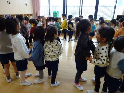 いちご組とお昼ご飯を食べてから一緒に遊びました。大好きな「らららでこんにちは」をしているところです!最初にペアになったお友達に戻ってきた時は「わあ!」とうれしい歓声があがりました。また一緒に遊ぼうね。