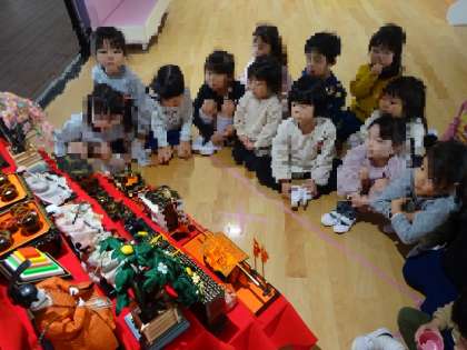 今日は大きい組さんが雛飾りを飾ってくれたので、みんなで見たり、歌を歌ったりしました。大きな7段飾りを見たのは初めての子もいて、「すごい!!」「これは誰??」ととても興味津々に見ていました。