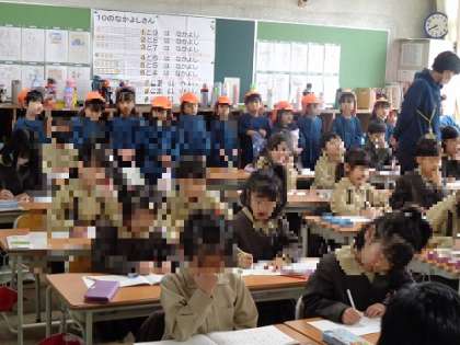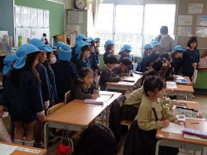 4時間目と給食の準備と食べている様子など見せていただき、お兄さん、お姉さんのしっかり勉強してる様子に見入っていました。