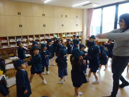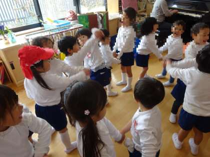 今日はお弁当の時、一緒に座るおともだちを♪ラララでこんにちはのダンスをして、ペアになったおともだちと一緒に食べました。