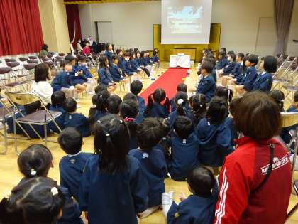 (1枚目)修了式予行に年少組、年中組の子供たちがお祝いの言葉と歌で参加しました。