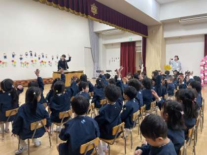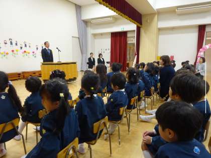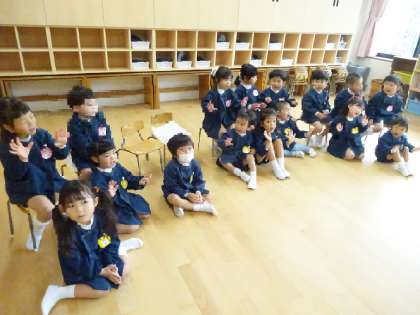 園長先生から、新しいクラスを呼んでもらって、元気よく返事をしていました。