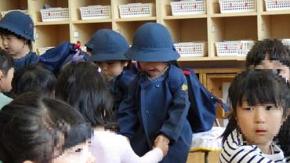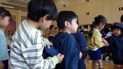 お帰りの準備を手伝う5歳児です。3歳児も少しずつ5歳児のお兄さん、お姉さんに信頼を寄せるようになり、お手伝いしてもらうことを受け入れています。