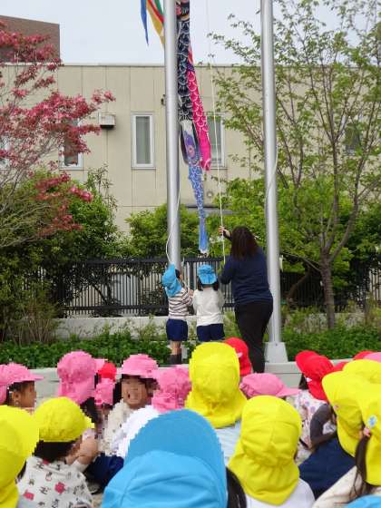 年長児の当番の子が大きなこいのぼりを空にあげてくれました。