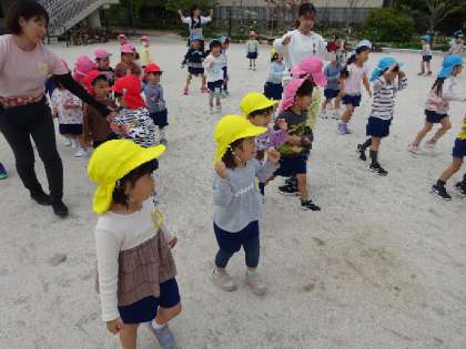 今日は曇り空でしたが、戸外で全園児で集会活動をしました。