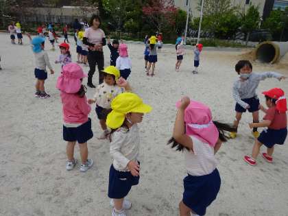 初めての全園児での集会でしたが、どの子も嬉しそうに参加していて、仲良し遊びではそら組がいちご組の友達を誘い、ほし組とゆき組も手をつないで、一緒に遊びました。