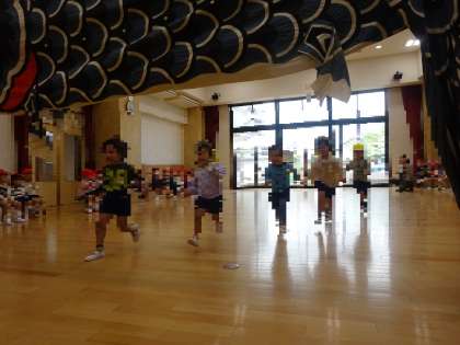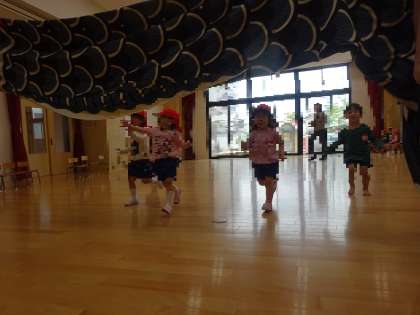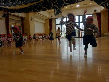 今日は年少組と年中組のお友だちと一緒に遊戯室でダンスをしたり動物になって歩いたりして遊びました。年中のおともだちの歩く姿を見て、いちご組さんもかっこよく歩いてました。
