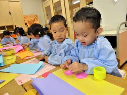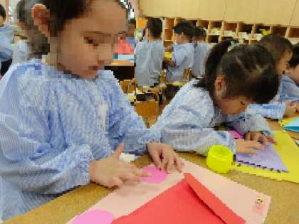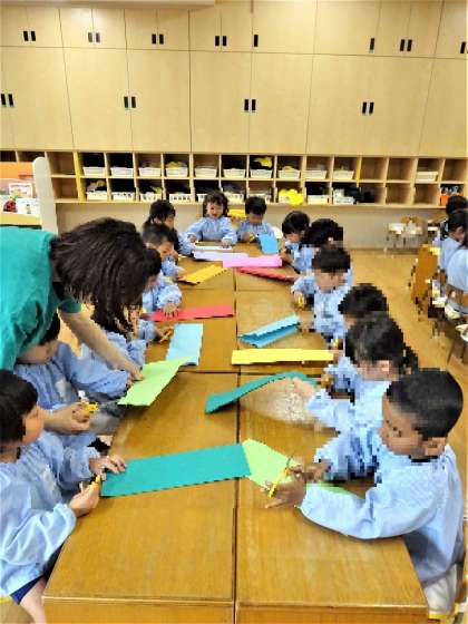 こいのぼりづくり2(4歳児) 公開日 2024/04/23 更新日 2024/04/23 お知らせ ハサミでしっぽを切った後は、こいのぼりの目をつけました。 昨日糊を使っていたので、約束もしっかりと覚えていて 「先生、糊はチョンやんな」と指で取って見せてくれました。 「ぬりぬり〜」と指で塗り広げて貼ることを楽しんでいました! 明日はうろこづくりです。 お家の人と一緒に模様づくりをすることを楽しみにしているので、 明日は参観で一緒に楽しんでいただけると嬉しいです。 いいね(0)