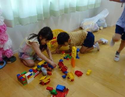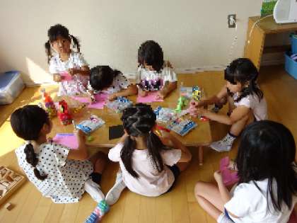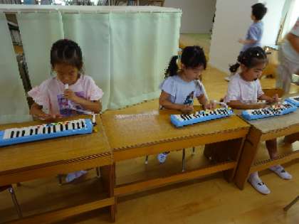 5歳児のクラスでは、1学期にしていた鍵盤ハーモニカがいつでも遊べる環境にあり、自分なりに探り弾きをして楽しんでいました。また、かいたりつくったりする遊びのコーナーやブロック遊びでは友達と一緒につくることを楽しむ姿がありました。