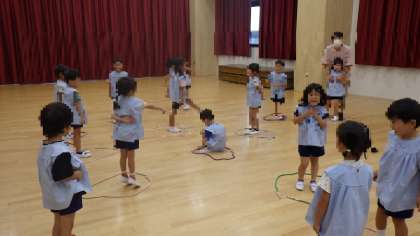 今日は水遊びのあとに遊戯室で縄跳びをつかって遊びました。