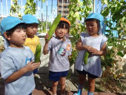 夏休み中に生長したキュウリとフウセンカズラを子どもたちと収穫しました。