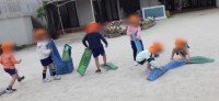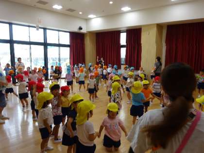 暑い毎日ですが、元気いっぱいに体を動かしたい!と遊戯室に集まってみんなで集会活動をしました。