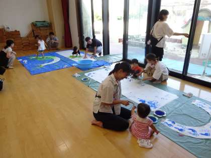 おもちゃで遊んだり玉入れをしたり、絵の具の手形ペッタンで大きな虹をつくりました。