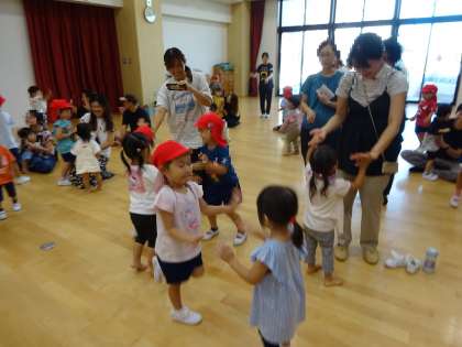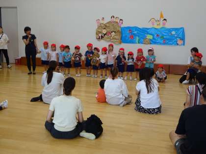 片付けが終わると、3歳児のいちご組がやってきて「とんぼのめがね」を歌ってくれたり、ふれあい遊びをしたりしました。