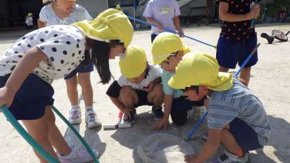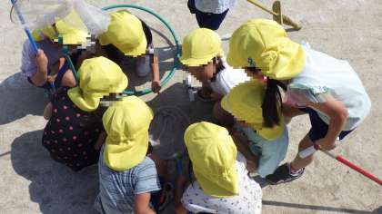 「先生、トンボ捕まえた〜!!」という声が聞こえると、周りにいた子どもたちも集まってきました。