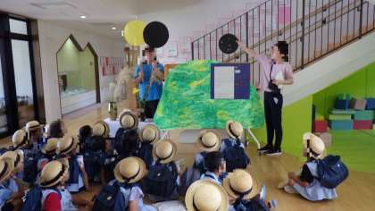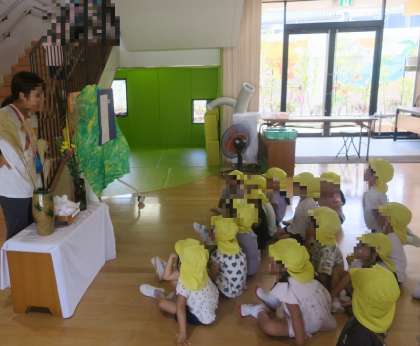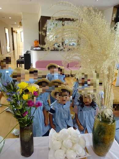 幼稚園では、月の満ち欠けに興味や関心がもてるような視覚物を用意したり、ススキや月見団子をお供えしたりしていて、各クラスで子どもたちと見ながら話をしました。
