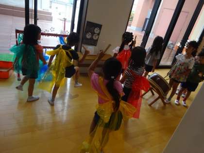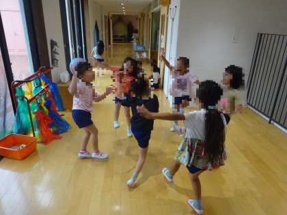 お部屋の遊びでは、友達とダンスをしたり音楽会の歌を歌ったりして遊んでいます。運動会で踊ったダンスを選び、友達と見合いながら楽しむ姿が見られました。お部屋遊びも充実した環境になるようにしていきます。