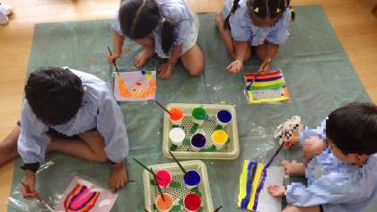 不織布に自分の好きな絵や模様、国旗などをかきました。中央公会堂で一緒に歌う園もみんな旗をつくっています。音楽会当日、きっとすてきな旗がたくさん見られると思います!楽しみにしていてくださいね。