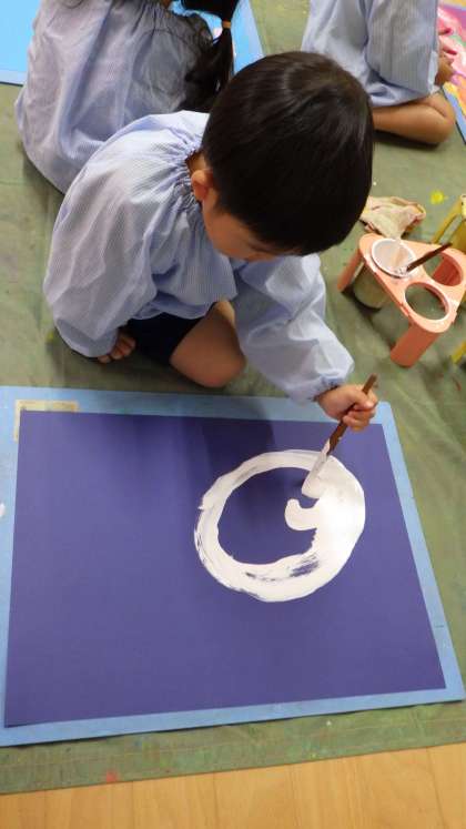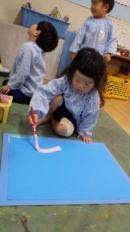 絵の具を用意すると「早くかきたい!」と、遊び着を意欲的に出して着ていました。
