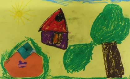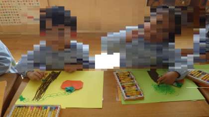 画用紙に貼ってからクレパスで絵をかきましたが、しっかり力を入れてかくと色が濃くなることをみんな知っており丁寧にかいていました。「おいしそうだなって見てるの」「みんなで柿を収穫してるところ」と素敵なお話も聞かせてくれました。