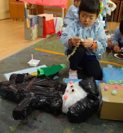 どうしたら接着するのかや、立つのかなどを考えたり工夫したりしながらつくることを楽しんでいます。展覧会までの残り数日も子どもたちが満足いくまで遊びます。