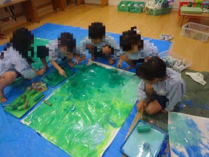 ローラーを使って絵の具を大きい紙に塗って遊んだり、ペットボトルを重ねて繋げて大きい船をつくったりしました。