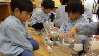 ペットボトルをガムテープやセロハンテープで貼って繋げる時に、倒れてしまわないように自然と1人が支えて1人がテープを貼ったりと、力を合わせながらつくる姿も見られました。