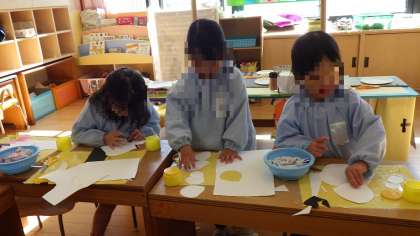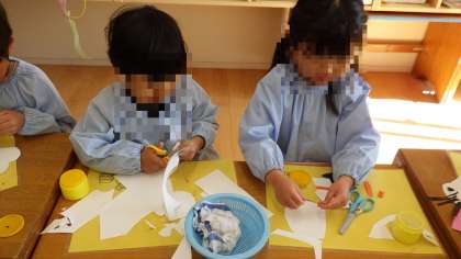 寒い季節だから…と子どもたちが思いを巡らせ、「雪だるまはどう?」「下は雪でいっぱいにしよう」という意見が出てきたので、今日は雪だるまをつくることに!